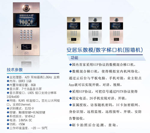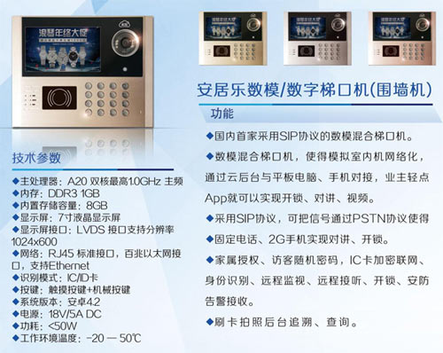 安居樂數(shù)字對(duì)講系統(tǒng)把模擬信號(hào)和數(shù)字信號(hào)融為一體,安居樂數(shù)字后臺(tái)搭建業(yè)主、物業(yè)管理、周界商圈、廣告經(jīng)營(yíng)、O2O的大數(shù)據(jù)交流平臺(tái),充分發(fā)揮各自優(yōu)勢(shì)資源,共同營(yíng)造增值空間,體現(xiàn)各自社會(huì)價(jià)值。讓用戶切身體驗(yàn)到:"家就在眼前,社區(qū)就在身邊,世界就在指尖,生活就在安居樂。"