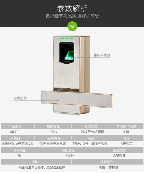 商品名稱:中控智慧(zkteco)ML10智能鎖家用電子鎖 室內門指紋鎖 鋼琴黑 標配